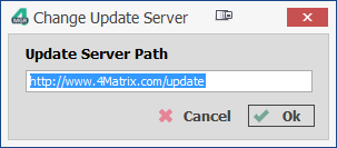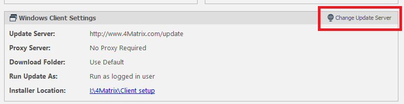 Newer versions of the 4Matrix Network Manager (3.7.4.0 onwards, March 17) support the use of a custom update server. This allows you to bypass the default setting in which 4Matrix will look to our website in order to check for updates. It will look to a path on your network instead. Although we do not recommend this approach due to the potential delay in clients receiving important fixes, you may need to utilise this option if you experience problems with your proxy server preventing updates, or if you would simply like to have more control over when the updates are available to clients.